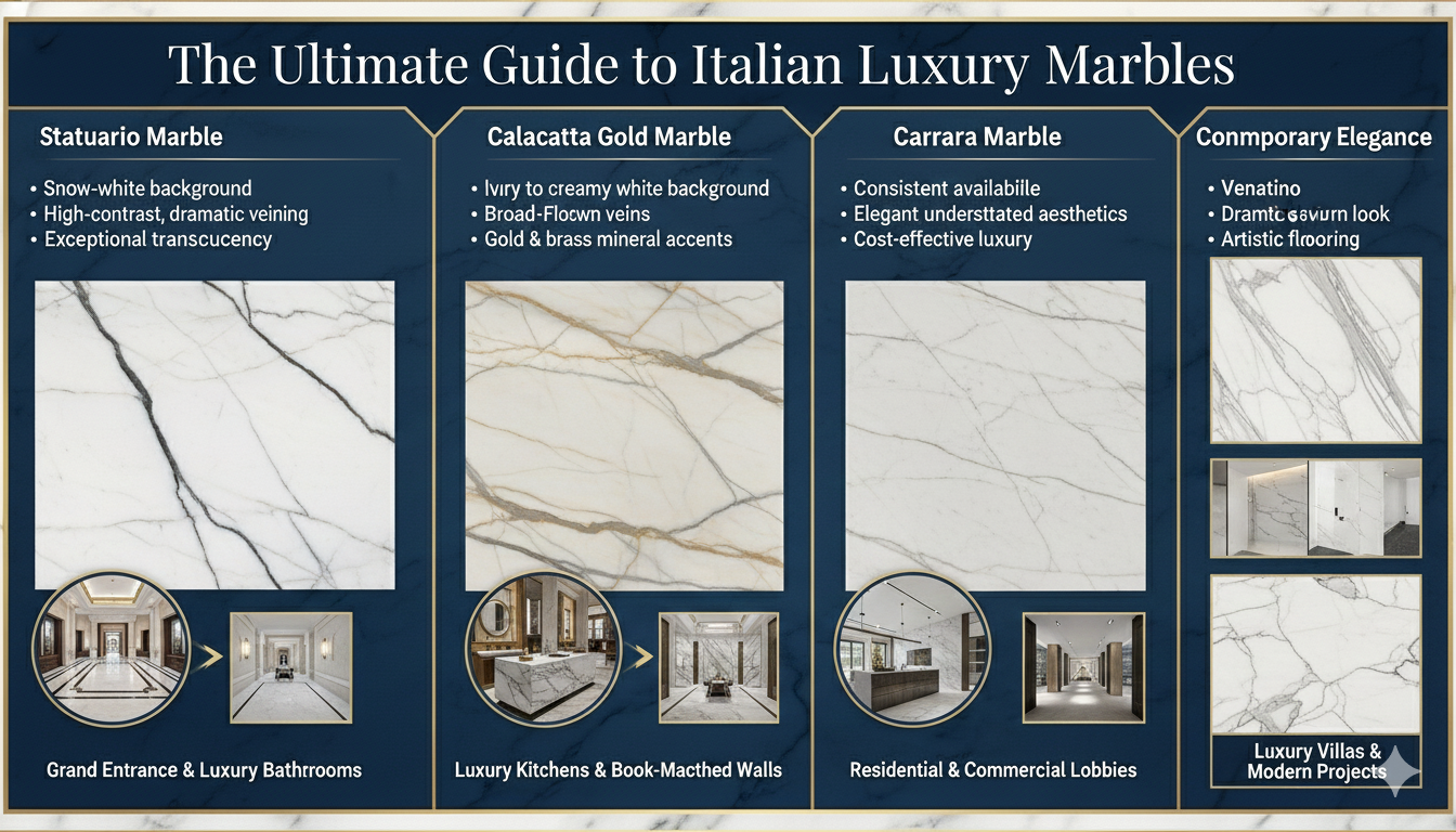 White Italian marbles represent the pinnacle of luxury stone worldwide. Below is a strategic comparison of the most sought-after varieties curated by Bhandari Marble Group: