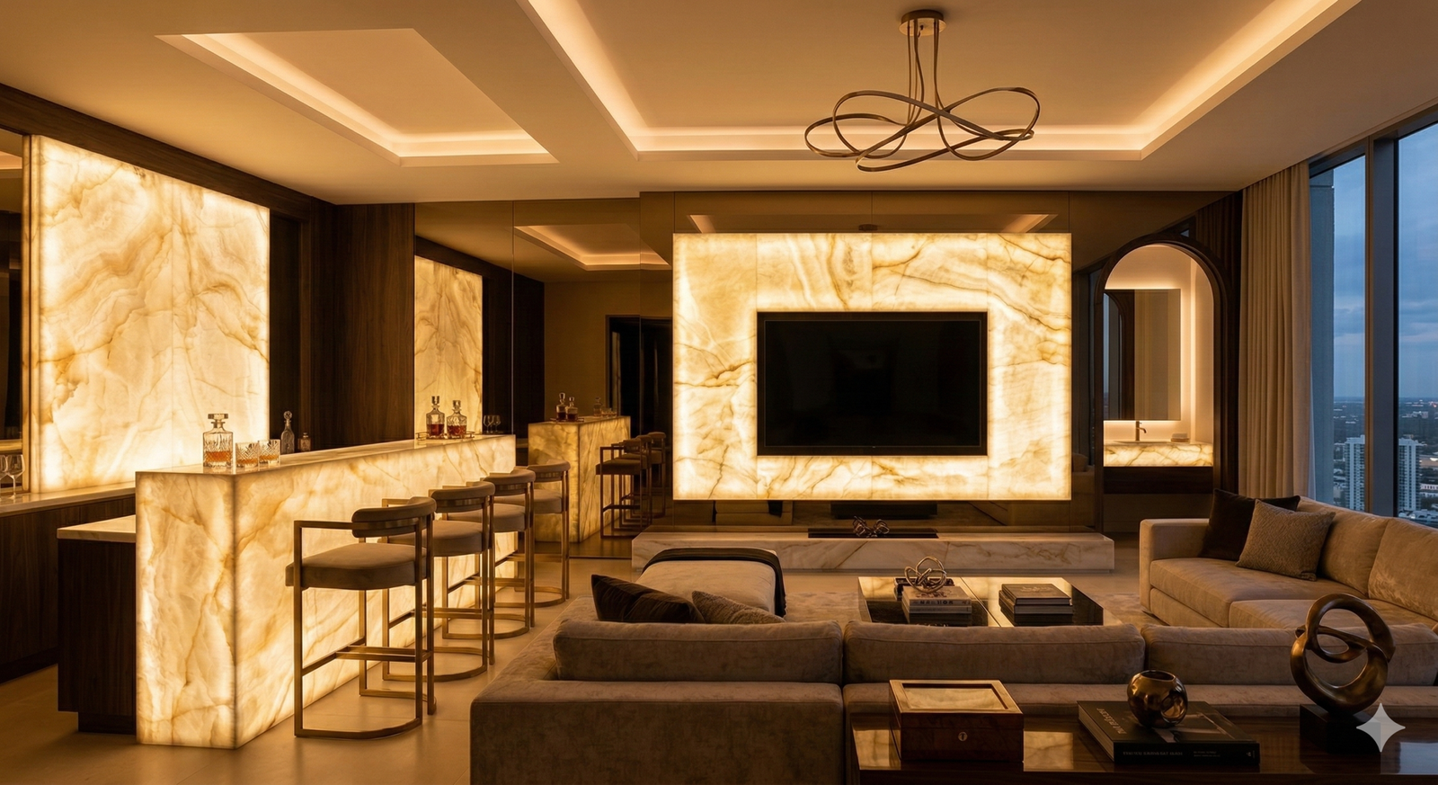 • Why it’s trending in 2026: Experiential lighting is a massive trend. A backlit Onyx wall acts as both an architectural feature and a source of ambient, mood-enhancing light.